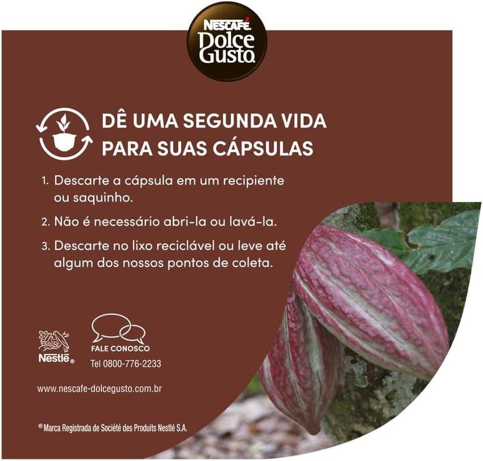 - NOSSO COMPROMISSO COM O PLANETA: 100% do nosso café é certificado por parceiros especializados. Isso quer dizer que além de sabermos de onde vem cada xícara de café. Você sabia que é fácil reciclar suas cápsulas de Nescafé Dolce Gusto? Basta colocar as cápsulas usadas em um saco ou caixa de papelão para que não suje ou molhe os outros materiais recicláveis. E caso haja muito líquido nas cápsulas, você pode deixá-las escorrendo por um tempinho antes de descartá-las. Não é preciso lavá-las e nem retirar o conteúdo interno. Descarte em um lixo reciclável e suas cápsulas serão encaminhadas para uma cooperativa e após os processos sua cápsula ganha uma segunda vida e se tornará um novo objeto!